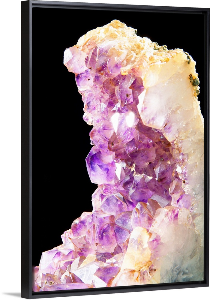 <p>Amethyst crystals. Amethyst is a variety of quartz (silicon dioxide), the most abundant mineral in the Earth's crust. The purple colour is caused by impurities of iron or manganese. Amethyst is found in Europe, the Americas and Africa, with the finest specimens occurring in Mexico and South America. Amethyst is popular amongst jewellers and mineral collectors.</p>