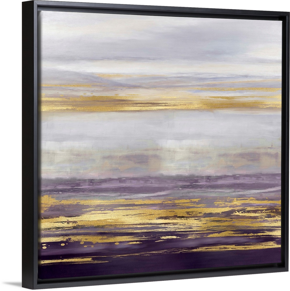 <p>Contemporary artwork featuring three gold brush strokes on a purple gradated background.</p>