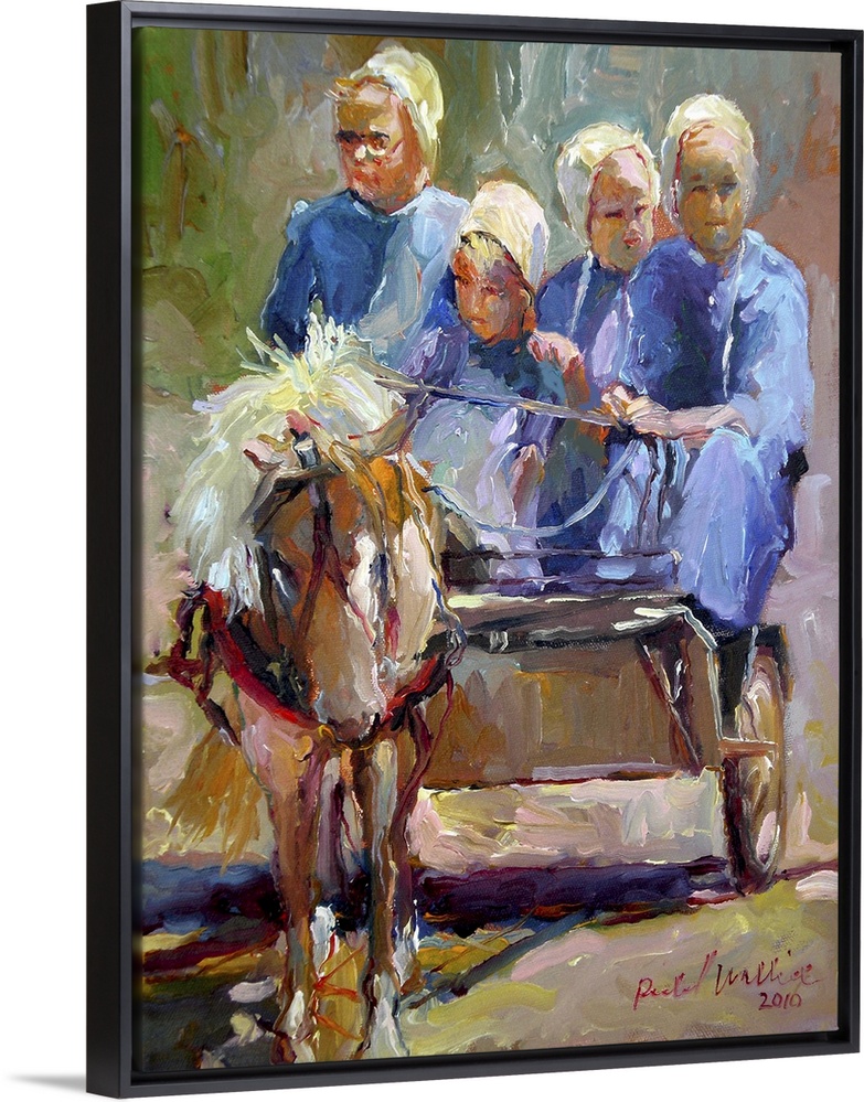 <p>Contemporary painting of Amish women in horse drawn cart.</p>