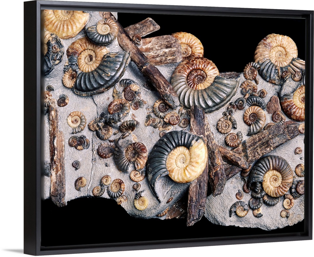 <p>Ammonites. Assortment of small and large ammonites clustered around pieces of wood. These are extinct marine animals which lived between 380 and 65 million years ago. Distantly related to the modern-day nautilus, ammonites were cephalopod molluscs, resembling a squid-like animal within a coiled shell. They lived in coastal waters and inland seas. These ammonites were found in lower lias rock of Lyme Regis, England. Lower lias is limestone rock which was laid down in the early Jurassic period (195-172 million years ago). These ammonites are from Andy Barton Cowap's Classic Jurassic collection.</p>