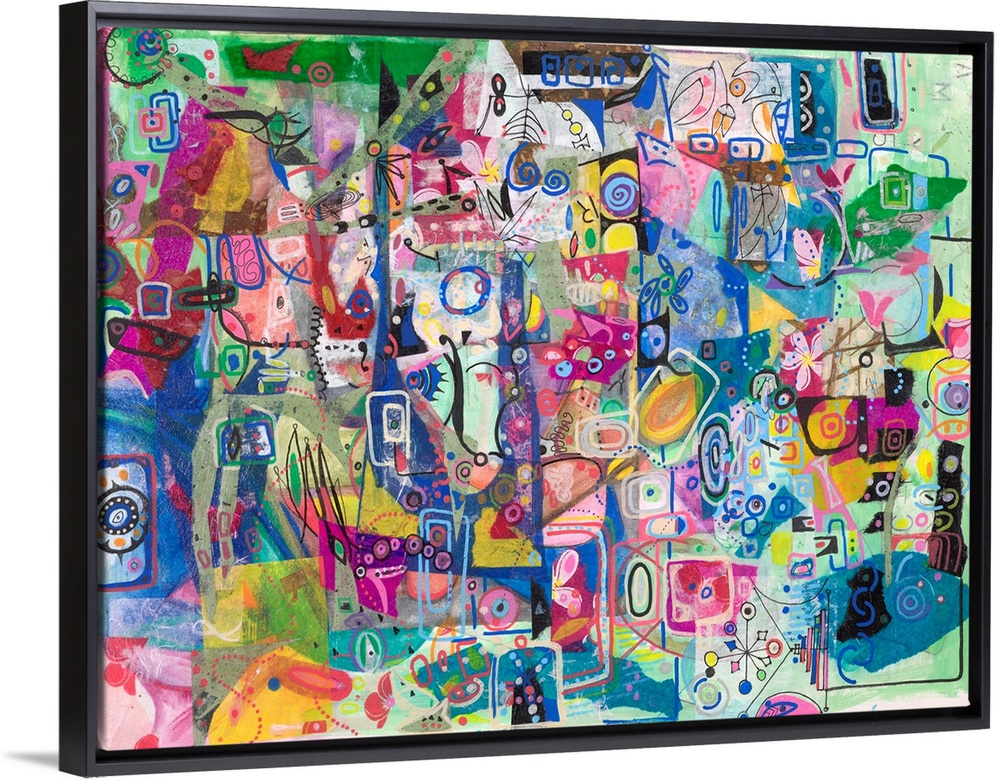 <p>A light, vibrant, contemporary piece of art in a grafitti style in bright pastel colors with elements of mid century design</p>