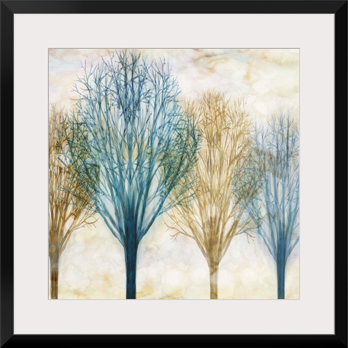 <p>Square artwork with Winter trees in blue and brown hues with a foggy sepia toned background.</p>