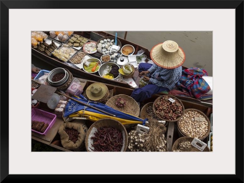 <p>Thailand, Amphawa Floating Market. Woman prepares food for customer in her dugout canoe 'shop.'</p>
