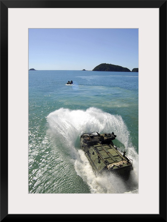 <p>Amphibious Assault vehicles exit the well deck of the amphibious transport dock ship USS Denver.</p>