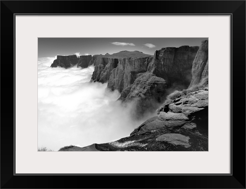 <p>High angle view black and white view of Amphitheatre range with Tugela Falls in foreground, Drakensberg uKhahlamba National Park, Kwazulu-Natal, South Africa</p>