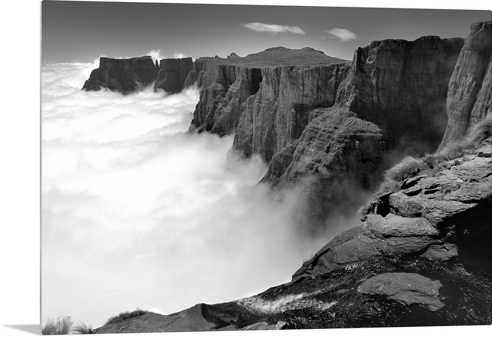 <p>High angle view black and white view of Amphitheatre range with Tugela Falls in foreground, Drakensberg uKhahlamba National Park, Kwazulu-Natal, South Africa</p>