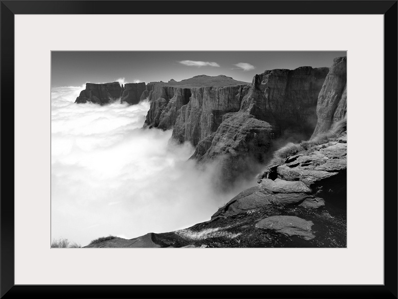 <p>High angle view black and white view of Amphitheatre range with Tugela Falls in foreground, Drakensberg uKhahlamba National Park, Kwazulu-Natal, South Africa</p>