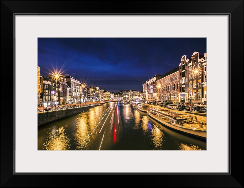 <p>Boats in the canal at night, reflecting street lights, Amsterdam.</p>