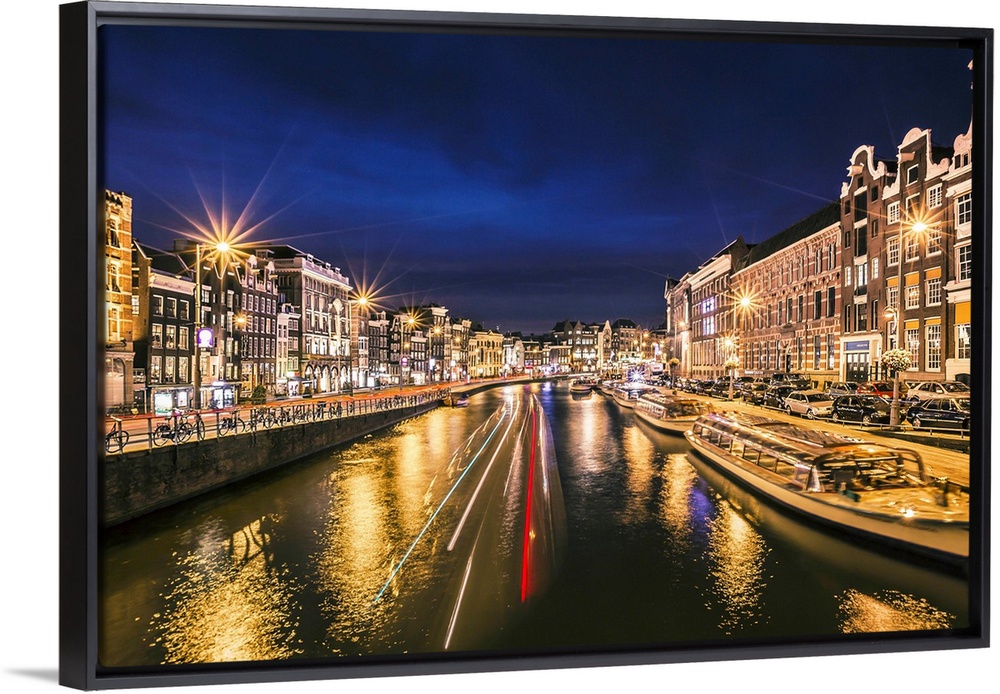 <p>Boats in the canal at night, reflecting street lights, Amsterdam.</p>