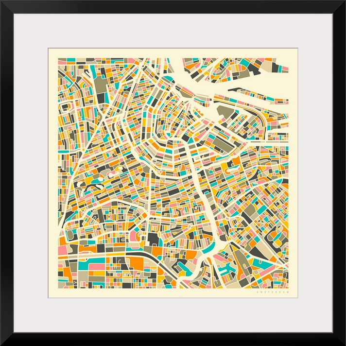 <p>Colorfully illustrated aerial street map of Amsterdam, Netherlands on a square background.</p>