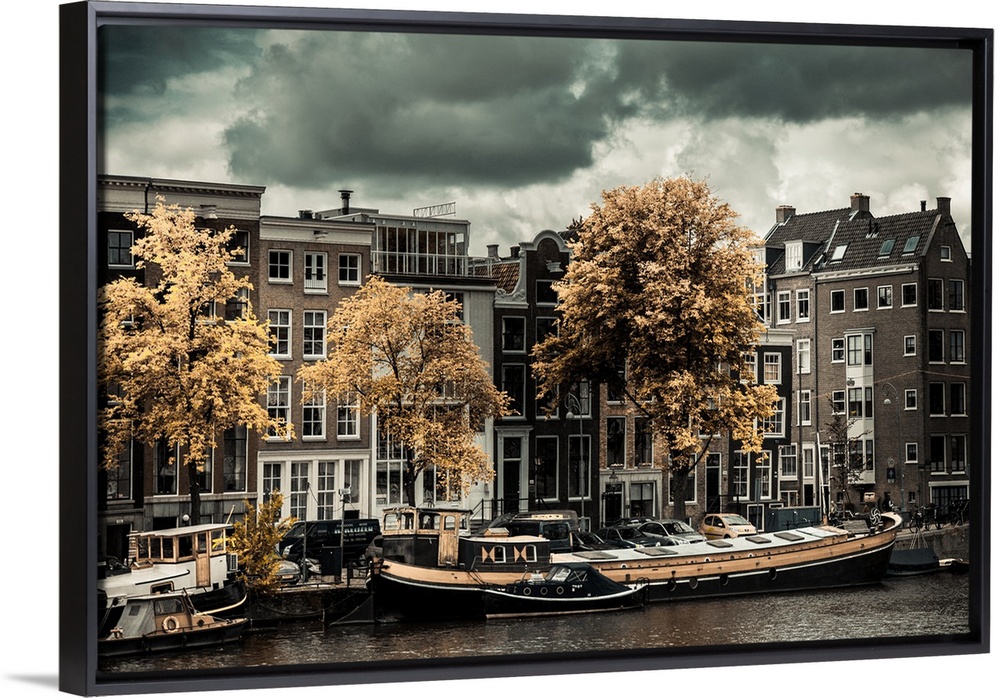 <p>Boats docked along the canal in Amsterdam in the fall.</p>