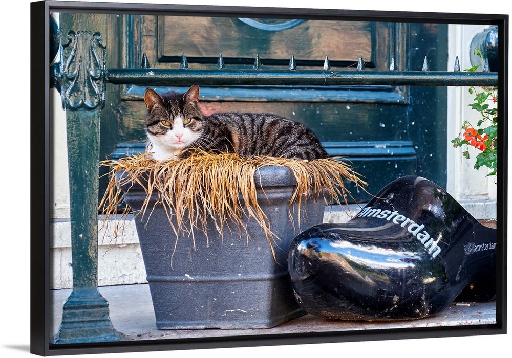 <p>Cat resting at a house entrance next to a Dutch Clogs, Amsterdam, Netherlands.</p>
