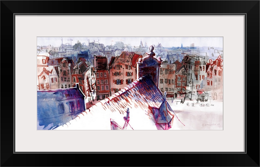 <p>Typical Amsterdam architecture seen from above in a panoramic view. Part of a building in the foreground is silhouetted in the bright afternoon sunlight. Drawn from life with watercolor, pencils, and marker.</p>