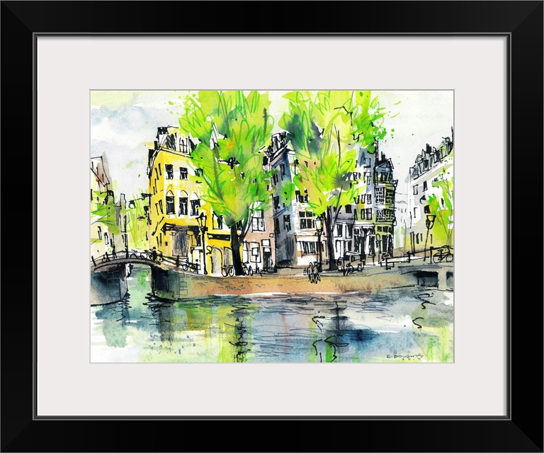 <p>Watercolor painting of a typical corner in Amsterdam - tall trees reflecting in the canal, old buildings leaning precariously to the side.</p>