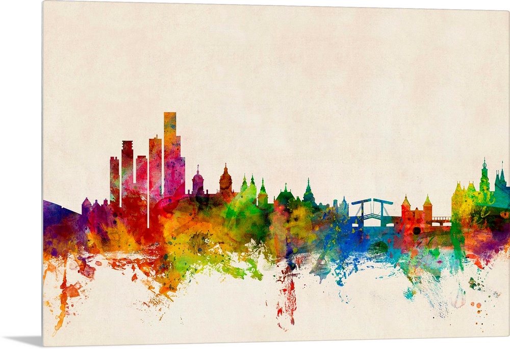 <p>Contemporary piece of artwork of the Amsterdam skyline made of colorful paint splashes.</p>