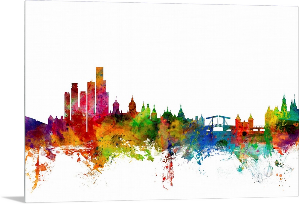 <p>Watercolor artwork of the Amsterdam skyline against a white background.</p>