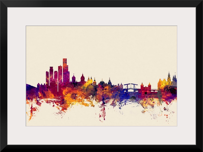 <p>Contemporary artwork of the Amsterdam city skyline in watercolor paint splashes.</p>