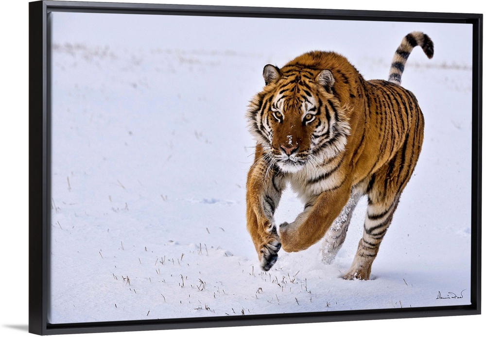<p>SIBERIAN or AMUR TIGER (Panthera tigris tigris) leaping through the snow, Bozeman, Montana, USA.</p>