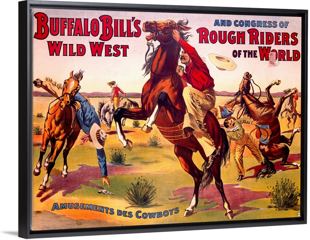 <p>A piece of vintage artwork that has numerous cowboys being thrown off the backs of the horses they are riding. Text is written on top and below of the piece.</p>