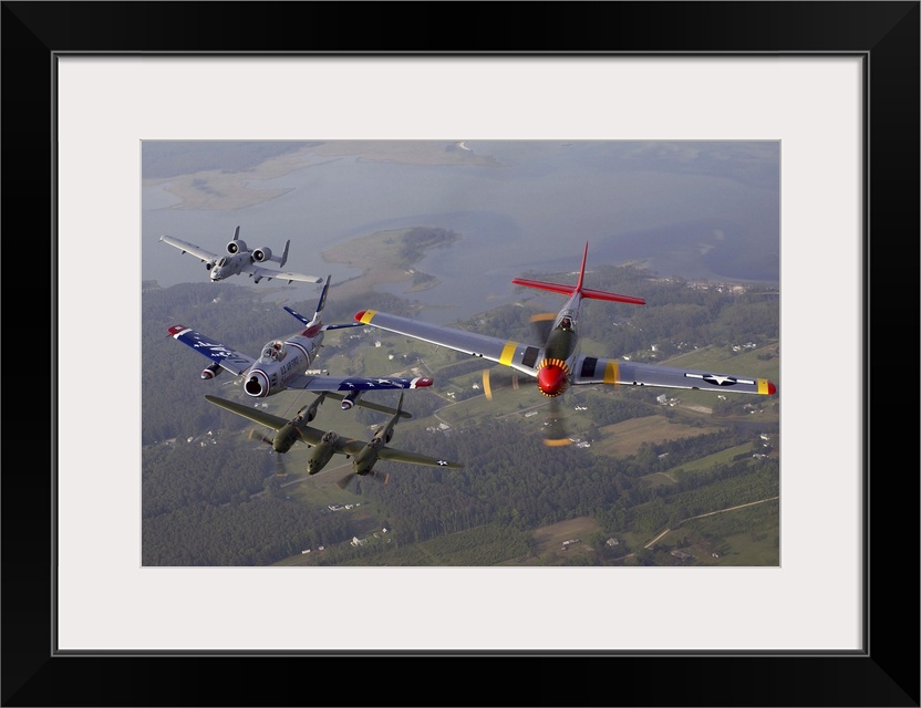 <p>An A-10 Thunderbolt, F-86 Sabre, P-38 Lightning and P-51 Mustang in flight.</p>