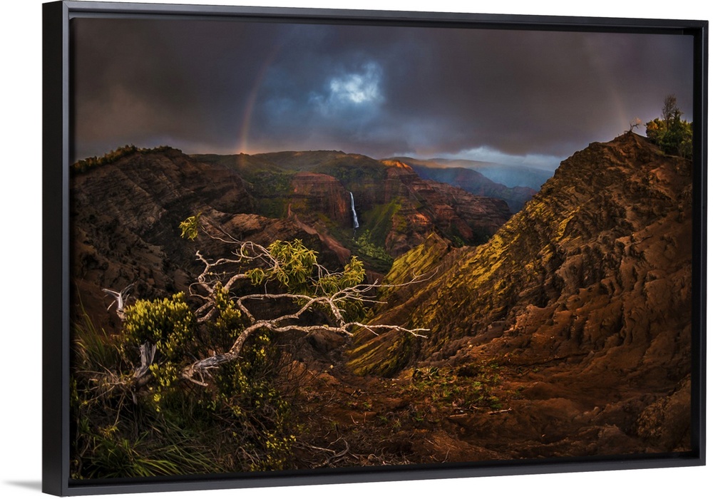 <p>An Acacia Koa tree reaches out over the Waimea Canyon as a faint sunset rainbow stretches over Waipo'o Falls, Kauai, Hawaii, United States of America, Pacific</p>