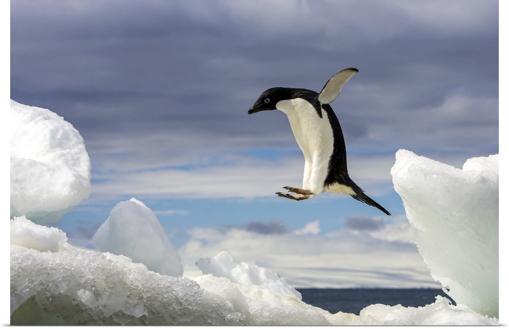 <p>From the National Geographic Collection, a giant photograph shows a Adelie penguin jumping onto an iceberg with open ocean in the background.</p>