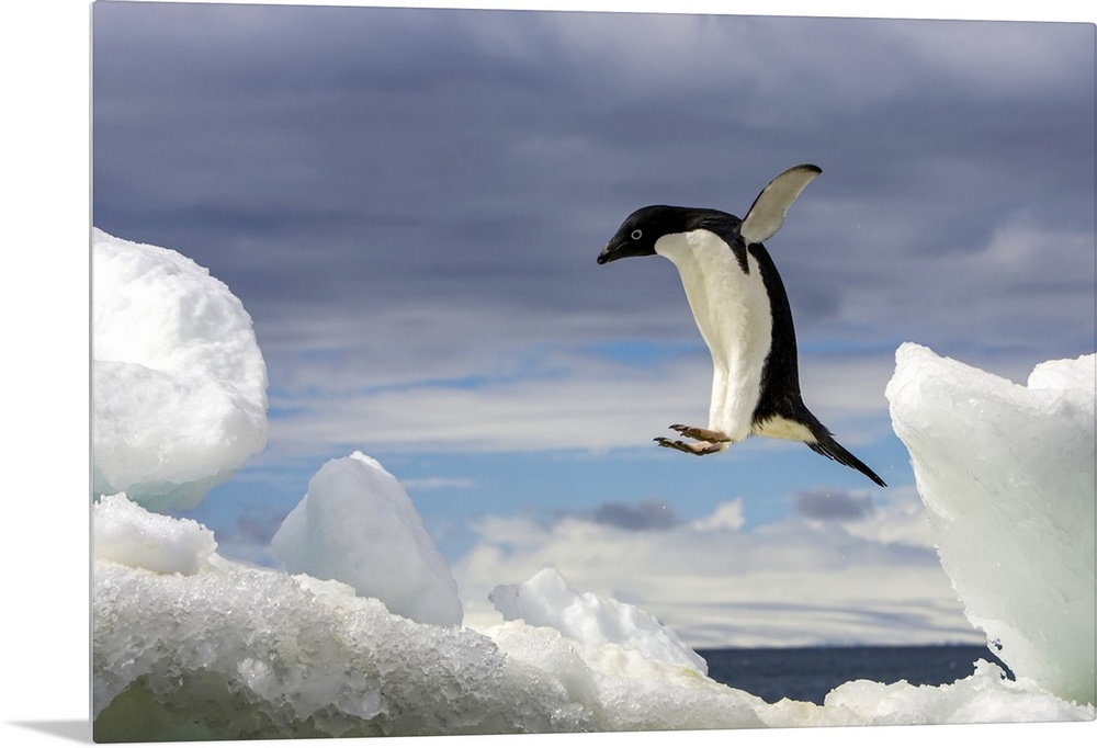 <p>From the National Geographic Collection, a giant photograph shows a Adelie penguin jumping onto an iceberg with open ocean in the background.</p>