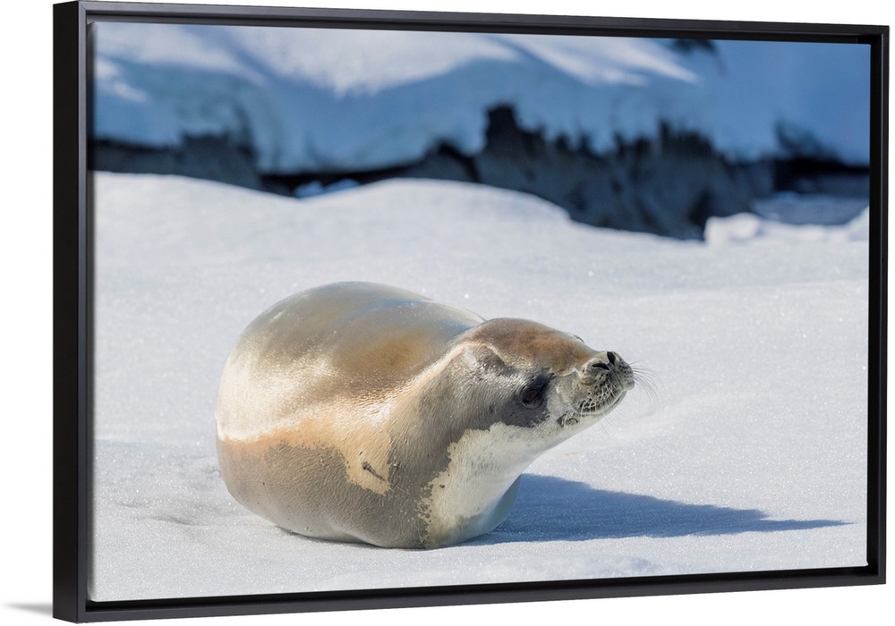 <p>An adult crabeater seal (Lobodon carcinophaga), hauled out on sea ice in the Useful Islands, Gerlache Strait, Antarctica, Polar Regions</p>