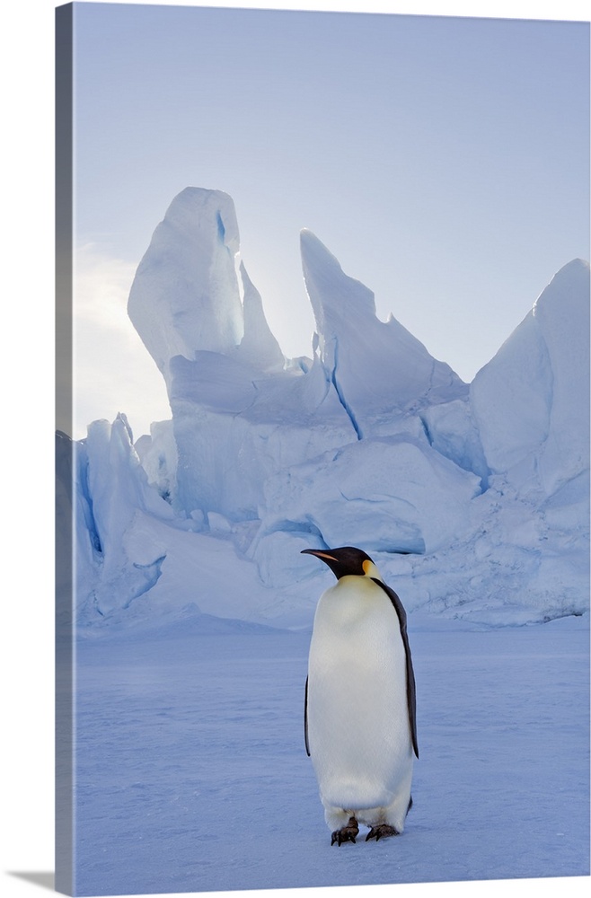 <p>An adult Emperor penguin standing on the ice in shadow, with head turned sideways, on Snow Hill island in the Weddell Sea.</p>