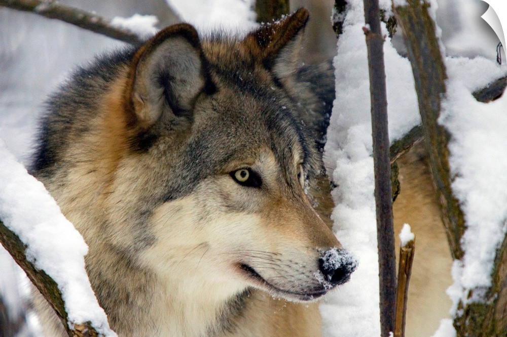 <p>Horizontal, close up photograph of the side of a gray wolfs face, surrounded by snow covered tree branches.</p>