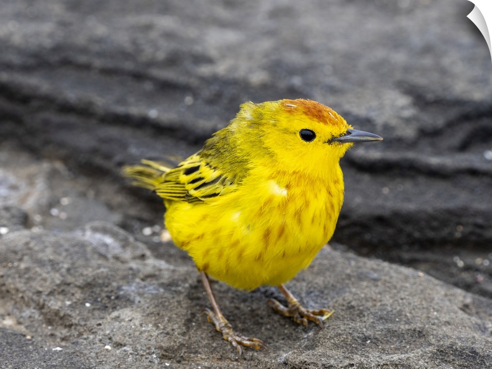 <p>An adult yellow warbler (Setophaga petechia), at Puerto Egas on Santiago Island, Galapagos, Ecuador, South America</p>