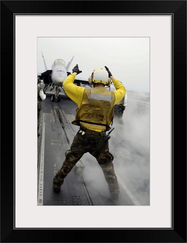 <p>Pacific Ocean, April 16, 2008 - An aircraft director signals an F/A-18C Hornet from taxi to launching position on the flight deck of the aircraft carrier USS Kitty Hawk (CV-63). Aircraft directors are responsible for safely moving aircraft on the flight deck.</p>