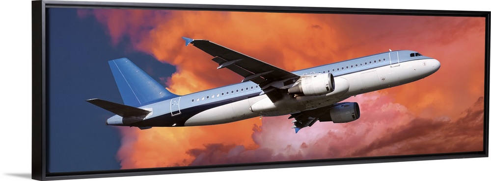 <p>This large panoramic picture is of a commercial airplane ascending into warm toned clouds.</p>