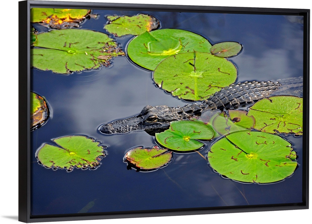 <p>An alligator floats in the afternoon sun amongst lily pads.</p>