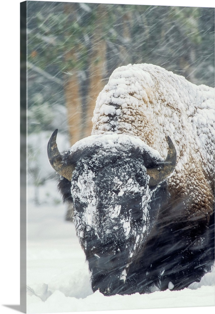 <p>An America bison (Bison bison) forages during a snow storm in Yellowstone National Park, Wyoming, United States of America</p>