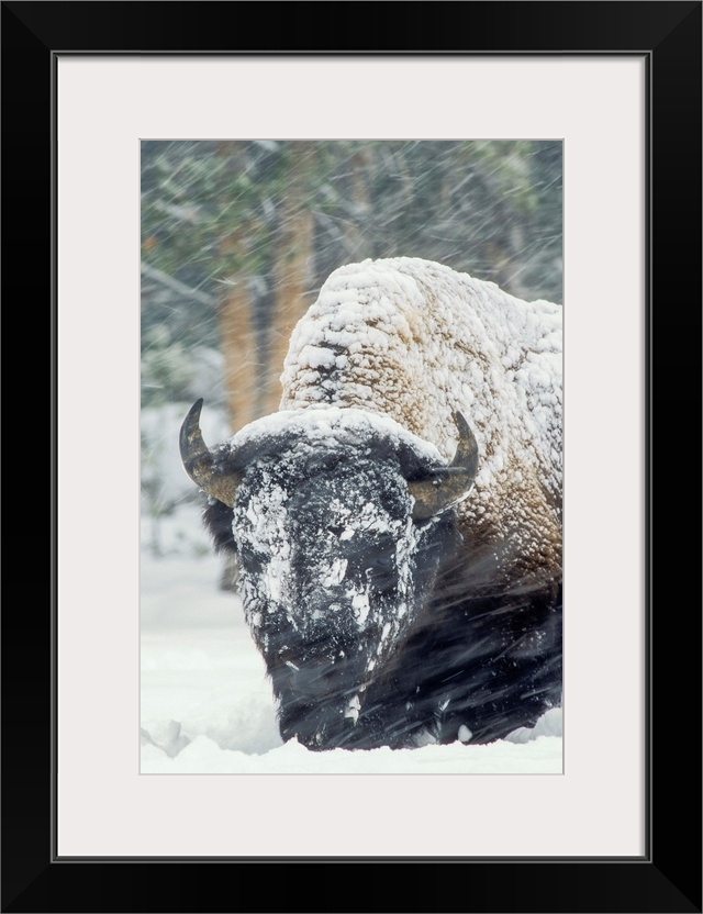<p>An America bison (Bison bison) forages during a snow storm in Yellowstone National Park, Wyoming, United States of America</p>