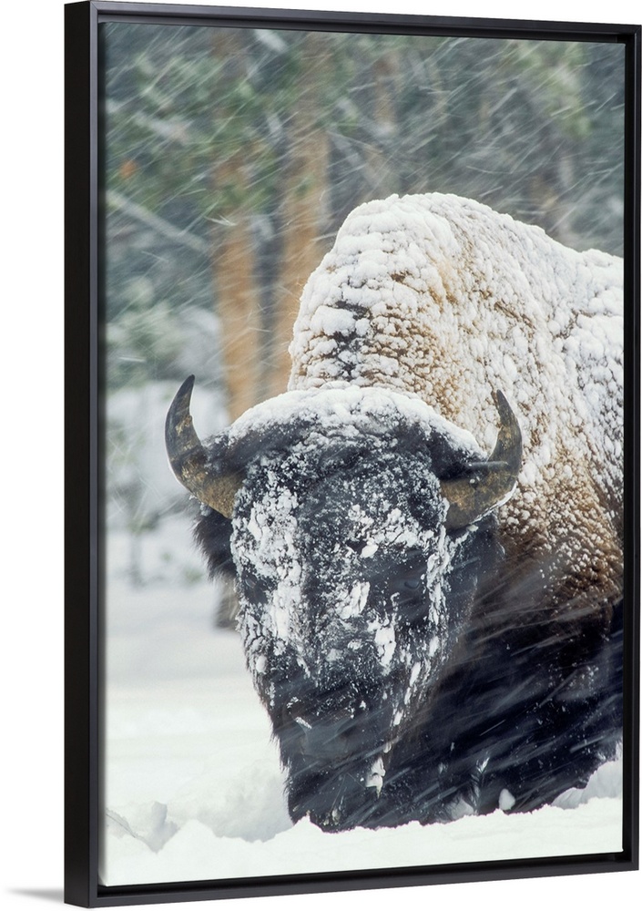 <p>An America bison (Bison bison) forages during a snow storm in Yellowstone National Park, Wyoming, United States of America</p>