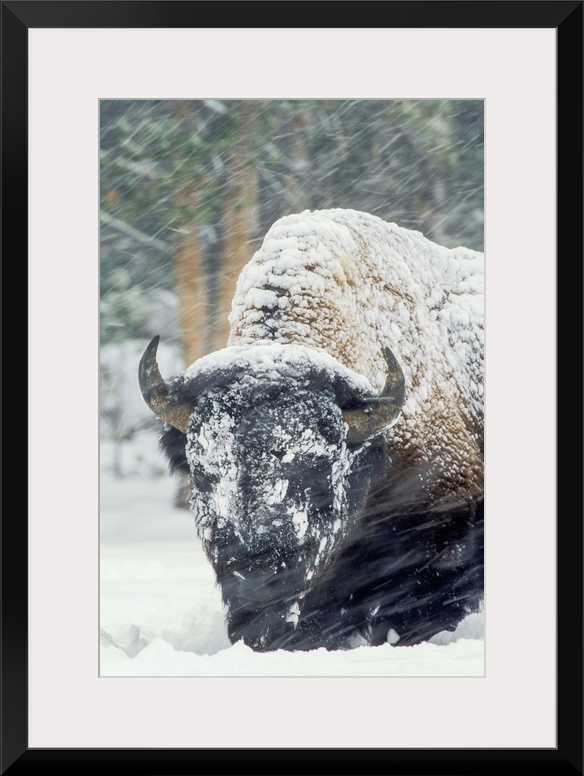 <p>An America bison (Bison bison) forages during a snow storm in Yellowstone National Park, Wyoming, United States of America</p>