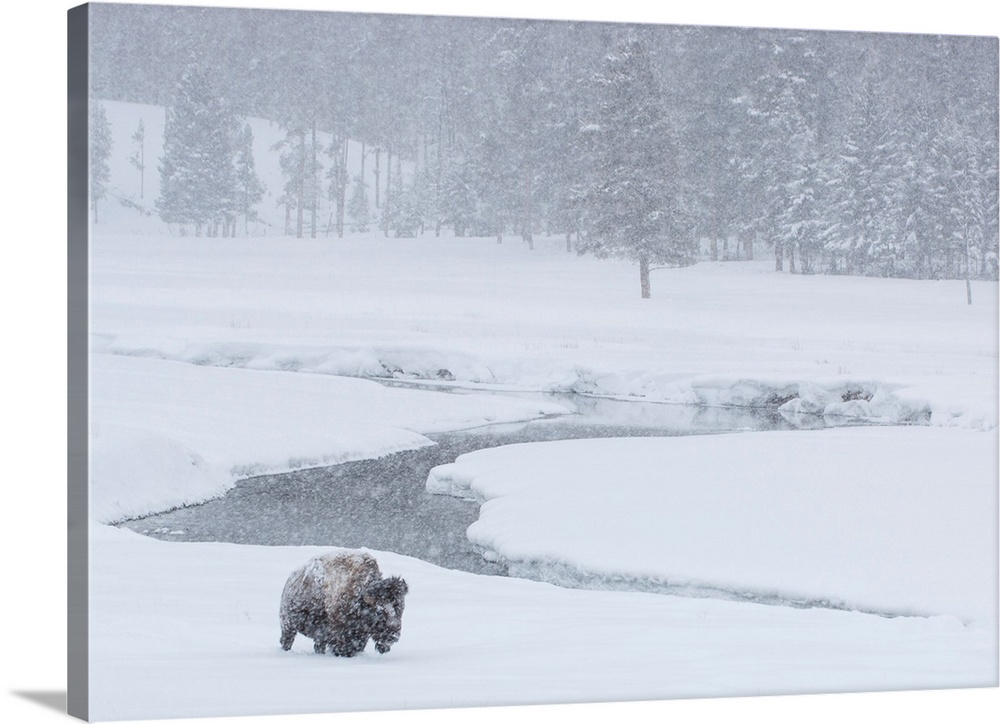 <p>An America bison (Bison bison) forages near a stream during a snow storm in Yellowstone National Park, Wyoming, United States of America</p>