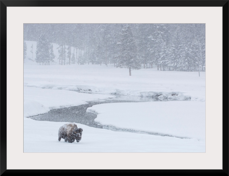 <p>An America bison (Bison bison) forages near a stream during a snow storm in Yellowstone National Park, Wyoming, United States of America</p>