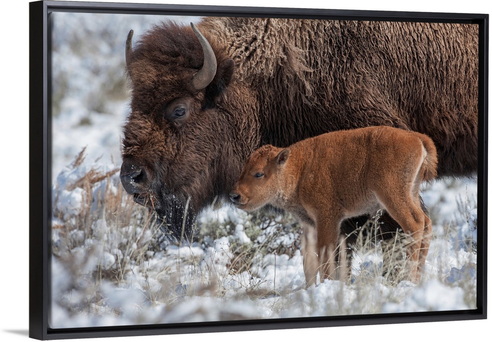 <p>An American bison (Bison bison) calf stands next to an adult in Yellowstone National Park, Wyoming, United States of America</p>