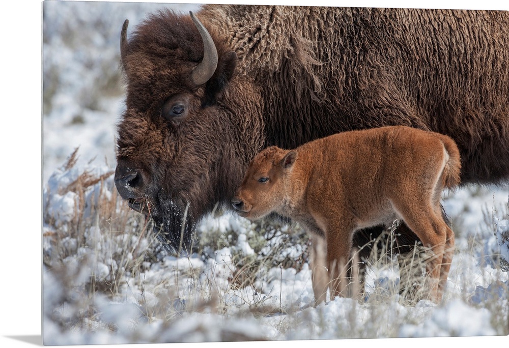 <p>An American bison (Bison bison) calf stands next to an adult in Yellowstone National Park, Wyoming, United States of America</p>