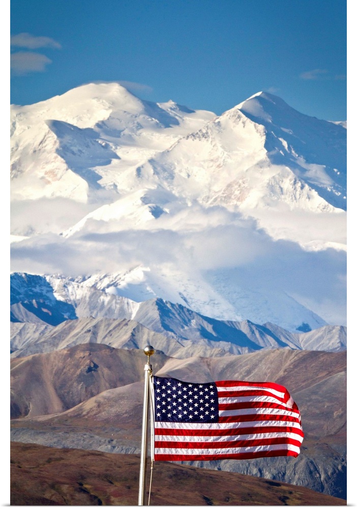 <p>An American flag flys in the wind at Eielson Visitor Center in August at Denali National Park. Mt. McKinley is in back of flag with blue sky. Central Alaska.</p>
