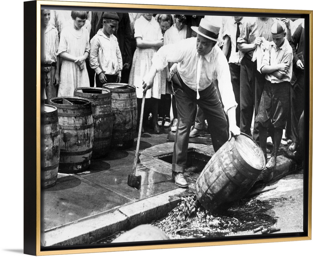 <p>An American official dumping kegs of bootleg liquor into the sewer during Prohibition. Photograph, c1925.</p>