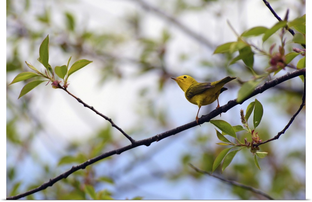 <p>An American yellow warbler, Setophaga petechia, on a tree branch. Parker River National Wildlife Refuge, Plum Island, Massachusetts.</p>