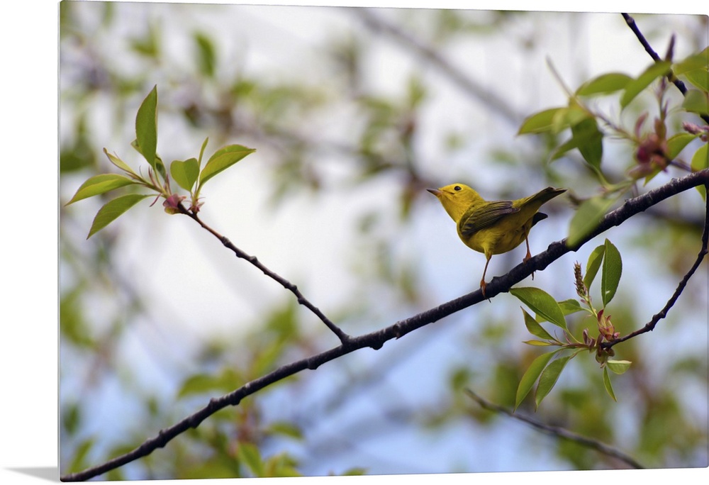 <p>An American yellow warbler, Setophaga petechia, on a tree branch. Parker River National Wildlife Refuge, Plum Island, Massachusetts.</p>