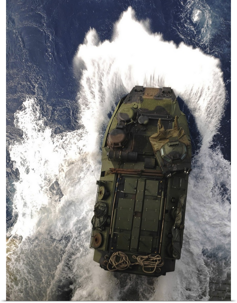 <p>An amphibious assault vehicle exits the well deck of USS Essex.</p>