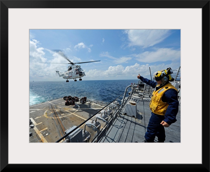 <p>An AS-332 Super Puma helicopter during a vertical replenishment.</p>