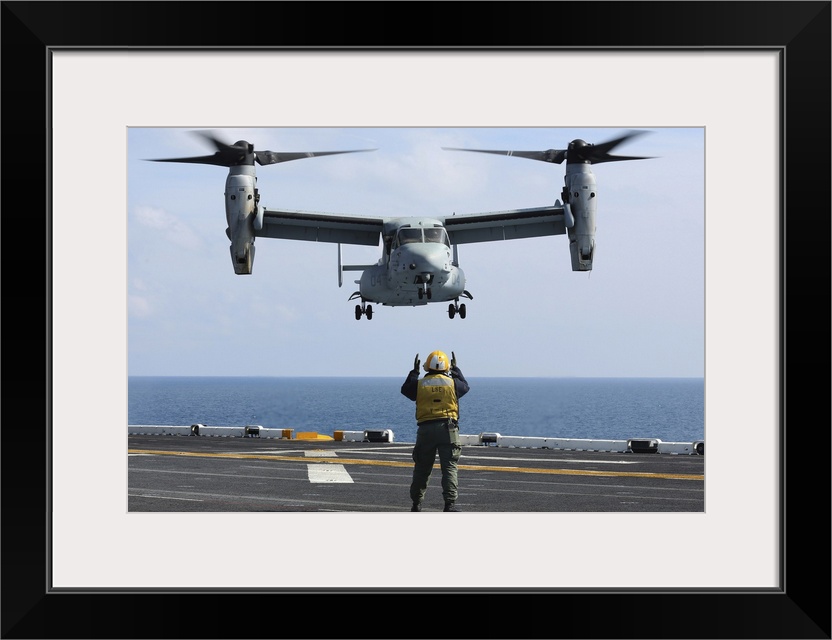 <p>Atlantic Ocean, February 16, 2013 - An aviation boatswain's mate directs the landing of an MV-22 Osprey on the flight deck of the amphibious assault ship USS Kearsarge.</p>