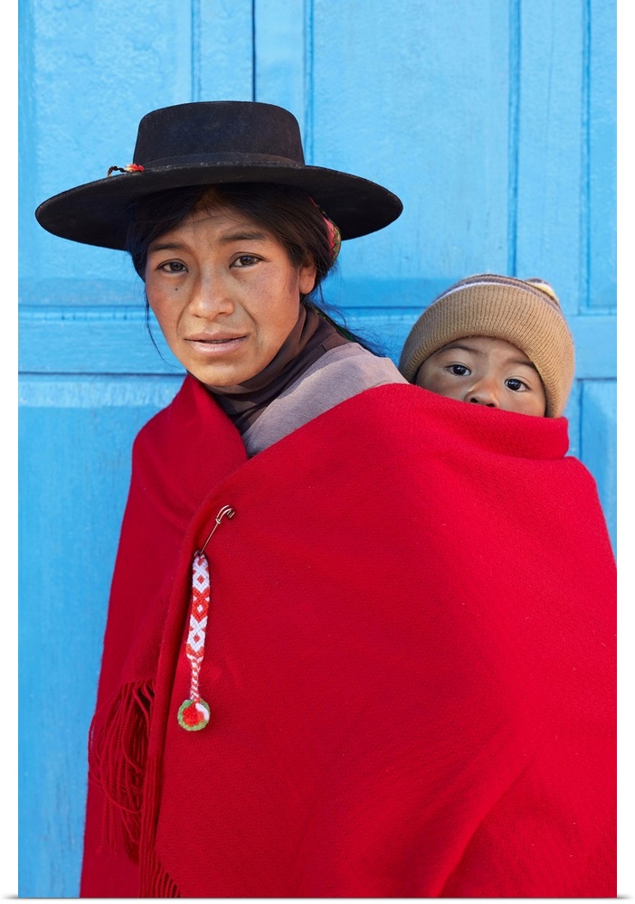 <p>Portrait of an Aymara mother in traditional clothes with her child standing in front of the antique church of Aparzo, Jujuy, Argentina.</p>